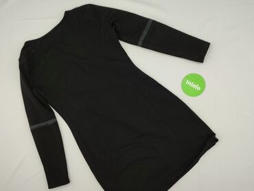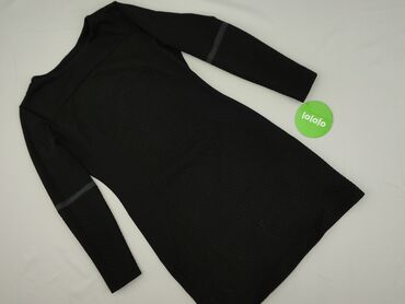 Czarna, dopasowana sukienka z długim rękawem. - Fason: obcisły, podkreślający sylwetkę, długość mini. - Dekolt: głęboki, zaokrąglony z przodu i z tyłu. - Materiał: elastyczna, prążkowana dzianina (...Stan:
