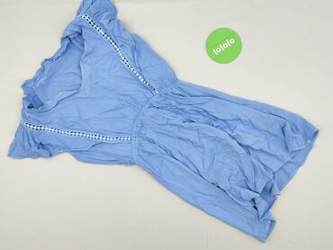 Jasnoniebieska sukienka damska z lekkiej, miękkiej tkaniny. - Krój: kopertowy dekolt w serek, delikatnie marszczona talia na gumce, rozszerzany dół. - Rękawy: krótkie, luźne. - Długość: do kolan l...