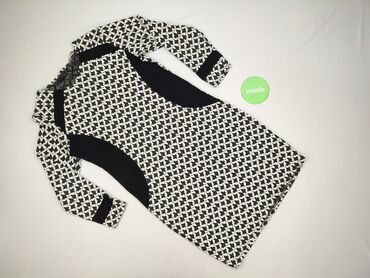 Sukienka damska z długim rękawem, w geometryczny, czarno‑biały wzór (romby/mozaika). - Krój: lekko trapezowy, długość przed kolano. - Dekolt: okrągły. - Rękawy: długie, proste. - Materiał: śred...