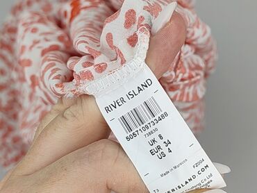 Sukienka damska marki River Island z krótkim rękawem, ozdobiona wzorem paisley w odcieniach szarości i bieli. Charakteryzuje się okrągłym dekoltem i marszczoną talią, która podkreśla sylwetkę. Tkan...
