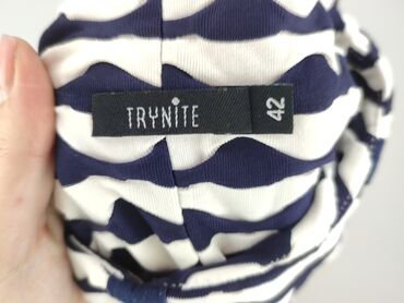 Sukienka TRYNITE, rozmiar 40 - Fason: dopasowana, bez rękawów, długość za kolano - Kolorystyka: biel z granatowymi akcentami - Wzór: panel z przodu i z tyłu z dekoracyjną tkaniną w poziome pasy (g...Sukienka TRYNITE, rozmiar 42
