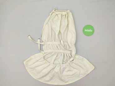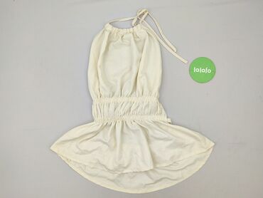 - Krój: wiązana na szyi (halterneck), talia mocno marszczona na szerokiej gumie, dół rozkloszowany z delikatną falbaną; odsłonięte plecy z regulowanymi paskami