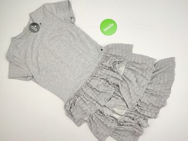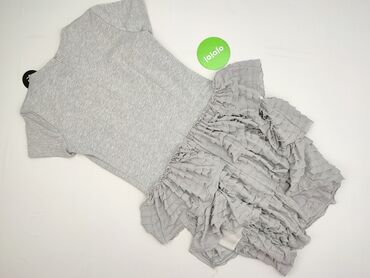 Sukienka damska w kolorze jasnoszarym. - Krój: luźny, prosty top z efektowną falbaną u dołu (asymetryczne wykończenie). - Rękawy: krótkie. - Dekolt: okrągły. - Zapięcie: z tyłu na mały guzik. - Dł...