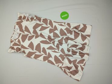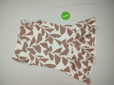 Wymiary orientacyjne (dla M): klasyczna szerokość w biuście i talii, luźny dół z falbaną. Kolorystyka: krem/biel z ciepłym brązem. Marka i metki widoczne na zdjęciach.