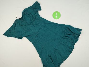 Sukienka damska w kolorze butelkowej zieleni. - Fason: kopertowy dekolt V, odcięcie i delikatne marszczenie w talii, rozkloszowany dół. - Rękawy: 3/4 z wiązaniami przy mankietach. - Długość: midi ...Stan: