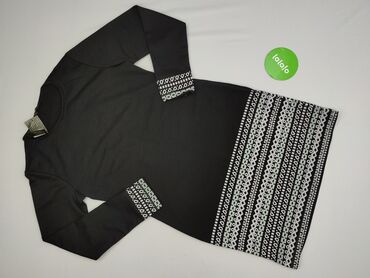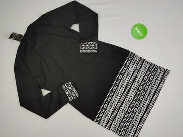 Sukienka damska z dzianiny, kolor czarny z biało‑czarnym, geometrycznym nadrukiem (linie i koła) z przodu oraz na dole tylnego panelu. - Krój prosty, długość do kolan lub lekko poniżej. - Rękawy ...