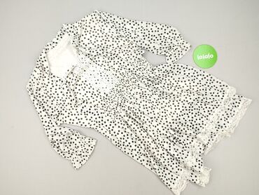 Sukienka damska w grochy - Kolor: biała w czarne kropki (różnej wielkości, rozłożone nieregularnie) - Fason: rozkloszowany dół, długie rękawy - Dekolt: głęboki w kształcie litery V - Detale: marsz...