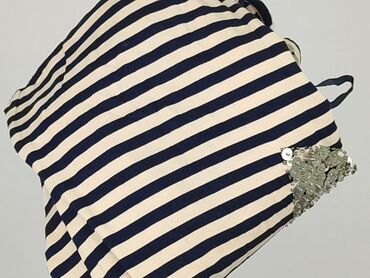 Bluzka/tunika w paski Paula R - Fason: luźna tunika z krótkim rękawem, okrągły dekolt - Wzór: granatowo-białe pasy w różnych kierunkach i szerokościach (efekt patchwork), dekoracyjna czerwona tasi...Stan: