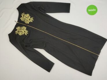 Czarna sukienka Mohito, rozmiar S - Fason: dopasowany, ołówkowy, długość do kolan - Rękaw: 3/4 - Dekolt: okrągły - Zapięcie: metalowy suwak z tyłu - Detale: zdobienia w formie złotych, kwadratowyc...