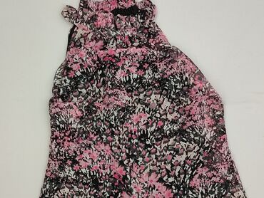 Sukienka damska w kwiaty - Kolor: intensywny róż z nadrukiem bukietów w odcieniach niebieskiego, fioletu i pastelowego różu - Krój: lekko rozkloszowana, bez rękawów, z okrągłym dekoltem; z przodu ...