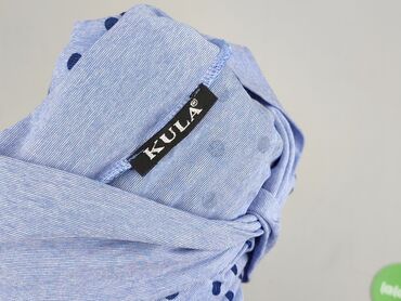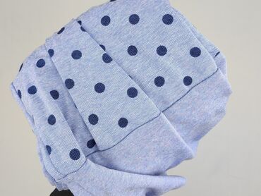 - Wzór i kolor: jasnoniebieska dzianina w granatowe kropki; dół i mankiety gładkie jasnoniebieskie.