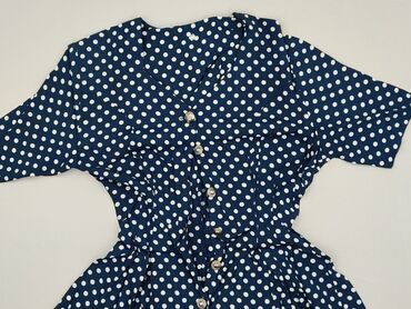 Granatowa sukienka w białe grochy – Lady Style, rozmiar M - Fason: lekko rozkloszowana, odcinana i marszczona w talii (gumka), podkreśla sylwetkę - Dekolt: zaokrąglony - Rękawy: krótkie, z delikat...