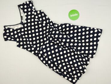 Sukienka damska XL, granatowa w grochy - Fason: góra dopasowana bez rękawów, odcięcie w talii z efektowną baskinką; dół z lekkiego, zwiewnego materiału w białe grochy, warstwowy/rozkloszowany. - D...