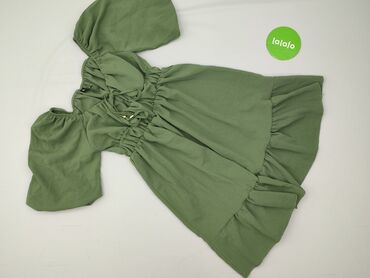 Sukienka damska, oliwkowa, z falbanami i wiązaniem w pasie - Krój: krótka sukienka z kopertowym przodem, wiązana w talii paskiem z tego samego materiału. - Rękawy: długie, rozszerzane (dzwony) z o...Stan: