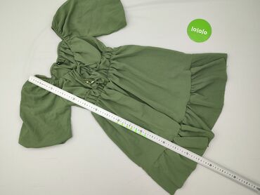 Sukienka damska, oliwkowa, z falbanami i wiązaniem w pasie - Krój: krótka sukienka z kopertowym przodem, wiązana w talii paskiem z tego samego materiału. - Rękawy: długie, rozszerzane (dzwony) z o...