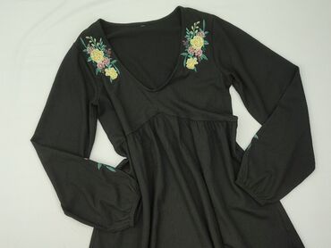 Sukienka czarna z kwiatowym wzorem - Fason: dopasowana góra z okrągłym dekoltem, długie rękawy; rozkloszowany, marszczony dół. - Wzór: gęsty, kolorowy nadruk/haft roślinny w odcieniach żółci, poma...