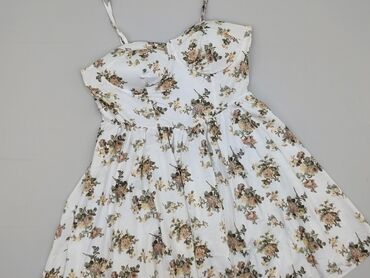 Sukienka damska w kwiaty – rozmiar M - Fason: mini, z krótkim rękawem, dekolt z gumką (możliwość noszenia na ramionach lub opuszczoną) - Kolor i wzór: białe tło, duże czerwone róże z czarnymi i ni...