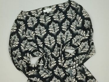 - Wzór: duży roślinny print na granatowym/czarnym tle; dół wykończony kontrastowym, drobnym geometrycznym motywem