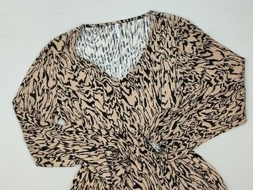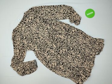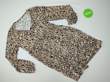 Sukienka damska z długim rękawem, w zwierzęcy wzór na beżowym tle z akcentami czerni, turkusu i bieli. Krój mini z lekko rozkloszowanym dołem. Dekolt w serek z krótką stójką, w pasie wszyta gumka p...Stan: