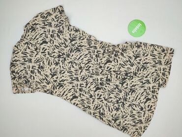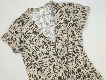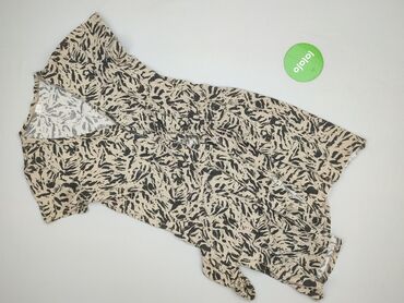Sukienka damska w panterkę - Wzór: panterka w odcieniach czerni i brązu na jasnym tle - Krój: luźny, z odcinaną talią i delikatnie marszczonym dołem - Dekolt: w serek - Rękaw: krótki, lekko opadaj...