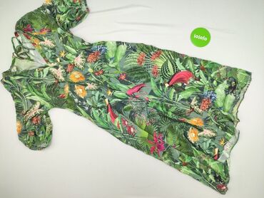 Sukienka MEDICINE – oversize, rozmiar L - Fason: prosta, oversize; długość do kolan (w zależności od wzrostu), krótkie rękawy, okrągły dekolt. - Wzór: tropikalny print na czarnym tle – kolorowe tu...