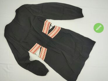 Czarna sukienka mini z długim rękawem, ozdobiona białym, falistym wzorem. Charakteryzuje się dekoltem w kształcie litery V i elastyczną talią, która podkreśla sylwetkę. Rękawy są luźne i zakończone...