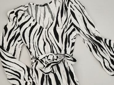 Sukienka Sinsay, rozmiar S. - Fason: dopasowany, długość midi, długie rękawy, dekolt w serek. - Wzór: czarno-biały, abstrakcyjny/zwierzęcy (zebra), na całej powierzchni. - Materiał: 92% poliester,...
