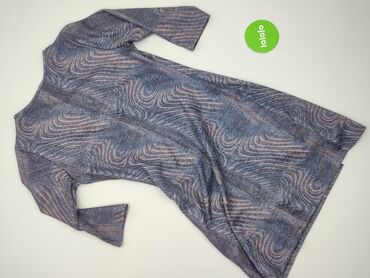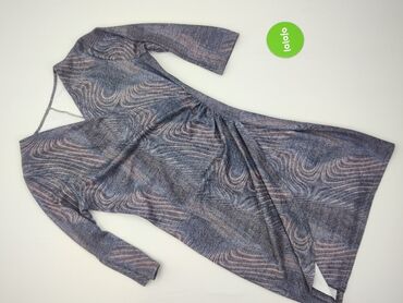 Sukienka damska z długim rękawem - Kolor: granatowy z jasnymi, krzyżującymi się pasami (geometryczny wzór). - Fason: dopasowana góra zapinana na rząd małych guzików z przodu; dół dłuższy, miękko m...
