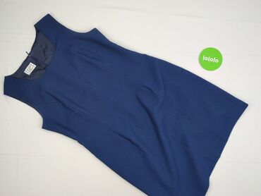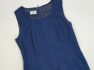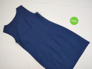 Granatowa sukienka bez rękawów - Krój: klasyczna sukienka ołówkowa lekko rozszerzana ku dołowi; góra z cięciami modelującymi sylwetkę. - Dekolt: okrągły. - Zapięcie: po bokach widoczne guziki deko...Stan: