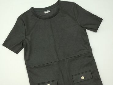 Czarna sukienka dzianinowa - Krój: rozszerzana ku dołowi, długość midi/za kolano, krótki rękaw, okrągły dekolt - Kolor: głęboka czerń, gładka bez nadruków - Materiał: 50% poliester, 45% bawełna, 5...