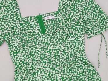 Sukienka w kwiaty – zielona - Krój: rozkloszowana sukienka do kolan, z elastycznym ściągaczem w pasie podkreślającym talię - Rękawy: krótkie, lekko bufiaste ze ściągaczami - Dekolt: okrągły z wyci...