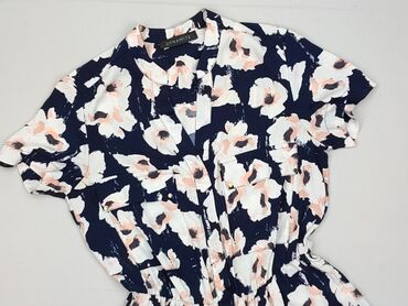 Sukienka damska Comeng, rozmiar L/XL. - Kolor: granatowy z wielobarwnym, kwiatowym printem (żółte, białe i zielone motywy roślinne). - Krój: taliowana, rozszerzająca się ku dołowi, długość mini/za...