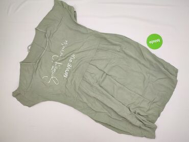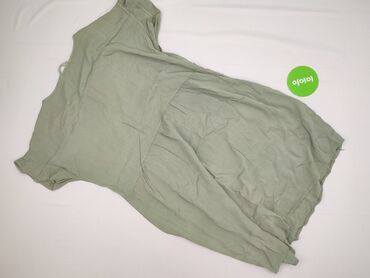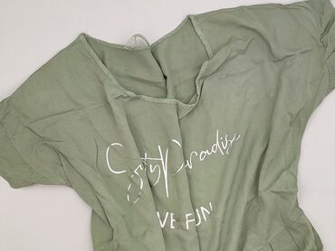 Na co dzieńSukienka damska z krótkim rękawem, kolor szałwiowej zieleni. Luźny, swobodny krój z odcięciem w talii i delikatnie marszczoną dolną częścią. Okrągły dekolt, z tyłu ozdobna pętelka z koronki/sznurka. Na przodzie nadruk w srebrnym kolorze: „Society Paradise / MOVE FUN”. Materiał: 100% wiskoza (metka na zdjęciu), miękka i przewiewna, idealna na ciepłe dni. Długość przed kolano. Brak kaptura i kieszeni. Nadruk w połysku dodaje subtelnego efektu. Dla kobiet. Używana.
