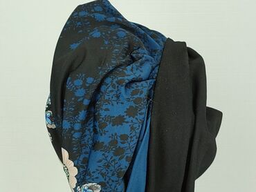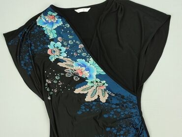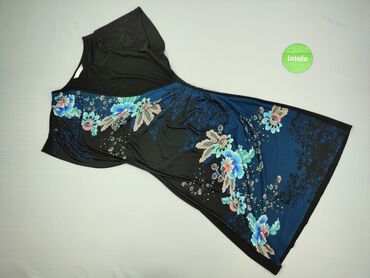 - Wzór: kwiatowy, secesyjno-orientalny print w odcieniach granatu, turkusu i pudrowego różu na czarnym tle; asymetryczny pas z motywem kwiatów przez przód