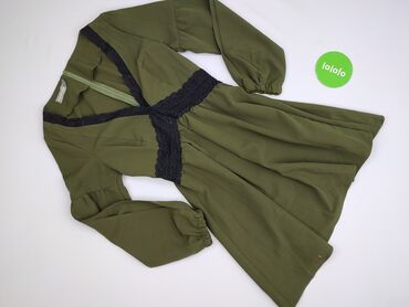 Sukienka damska, dzianinowa, w kolorze khaki/oliwkowej zieleni. - Fason: dopasowany, mini, z okrągłym dekoltem - Rękawy: długie, z aplikacjami/koronkowymi wstawkami w odcieniach zieleni na ramiona...
