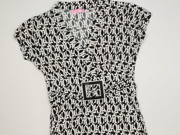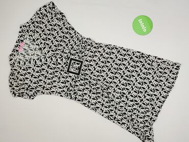 Sukienka damska z krótkim rękawem, rozmiar XL. - Kolor: biały w czarne, graficzne wzory (motywy geometryczne i kwiatowe). - Krój: dopasowany, długość przed kolano; dekolt kopertowy w kształcie V....