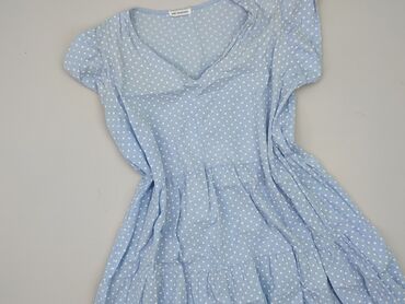 Sukienka damska w kropki – niebieska - Krój: dopasowana, długość przed kolano, falbana na dole - Dekolt: hiszpański/łódka z elastyczną gumką (można nosić opuszczoną na ramiona) - Rękaw: do łokcia ...