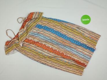Sukienka damska bez ramiączek marki Oncia, w rozmiarze 38. Górna część w kolorze beżowym, natomiast rozkloszowany dół sukienki ozdobiony jest wzorem w poziome pasy w odcieniach żółci, brązu, beżu i...