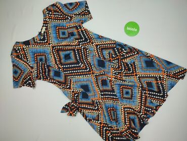 Sukienka damska z krótkim rękawem, rozmiar 44. - Fason: dopasowany, długość midi/przed kolano, okrągły dekolt. - Wzór: etniczne/geometryczne pasy i motywy tribal w odcieniach beżu, granatu, błęki...