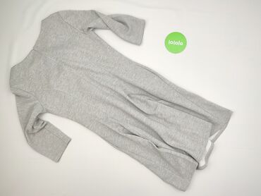 Szara sukienka damska z dzianiny, casual - Krój: prosta, długość do kolan - Rękawy: 3/4 - Dekolt: okrągły z czarną lamówką - Detale: czarne wykończenia przy mankietach i dole, napy/ozdobne zatrzas...