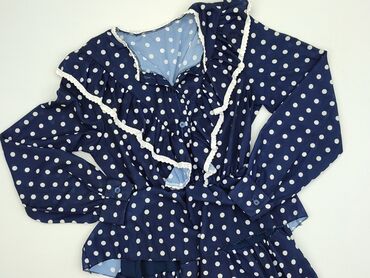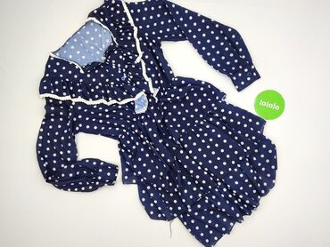 Granatowa sukienka w białe groszki, rozmiar M. - Krój koszulowy z kołnierzykiem - Długość midi, rozkloszowany dół - Długi rękaw z gumką przy mankiecie - Pasek do wiązania w talii + elastyczna tali...