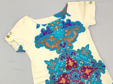 Sukienka damska o luźnym kroju, z krótkim rękawem. Tkanina lekka, przewiewna, w kwiatowo‑paisleyowy print w odcieniach żółci, różu, czerwieni i zieleni. Dekolt w kształcie litery V z wąskim, dekora...