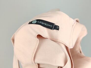 Sukienka damska, rozmiar M - Krój: prosty, długość za kolano, dekolt w serek - Rękawy: krótkie z falbanami; falbana również na dole sukienki - Wzór: złote, metaliczne kropki na pudrowo‑różowym tle...