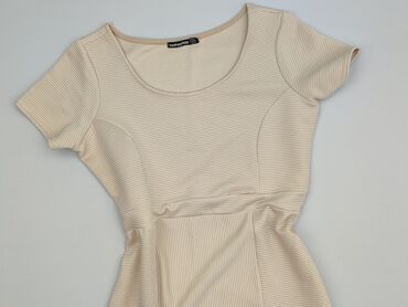 - Krój: krótkie rękawy, okrągły dekolt, cięcia modelujące w biuście, podkreślona talia