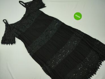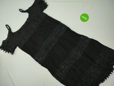 Sukienka damska czarna, rozmiar S. - Fason: lekko rozkloszowana, długość do kolan (widoczna falbanka na dole). - Dekolt: szeroki, z ozdobną koronkową wstawką w kształcie litery V z kwiatowym motyw...