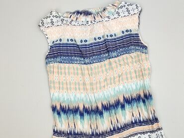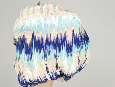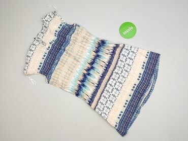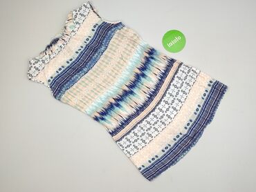 Sukienka damska Orsay, bez rękawów, z etnicznym/geometrycznym printem w pastelowych barwach: brzoskwiniowy, miętowy, biel i granat. Miękki, lekki materiał z delikatnymi marszczeniami, falbanką przy dekolcie oraz elastycznym wykończeniem u dołu tworzącym subtelną bombkę. Krój prosty, lekko taliowany, długość mini/ponad kolano. Idealna na lato, na co dzień i na wyjazdy. Wzór w poziome pasy łączy motywy ikat i drobne romby, co optycznie wysmukla sylwetkę. Marka: Orsay. Dla kobiet. Używana. Stan: bardzo dobry.