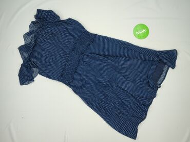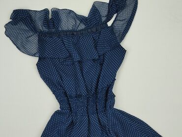 Sukienka damska, granatowa w białe grochy, rozmiar 42. - Fason: midi, bez rękawów, lekko dopasowana w talii, dół z falbaną/wykończeniem w stylu hiszpańskim - Dekolt: okrągły - Zapięcie: zamek na p...