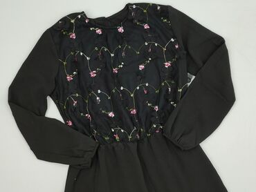 Sukienka damska z koronkowym wzorem - Krój: dopasowana góra, od talii lekko rozkloszowany dół - Rękaw: długi - Dekolt: okrągły, wykończony czarną lamówką - Wzór/materiał: czarna koronka o kwiatowy...