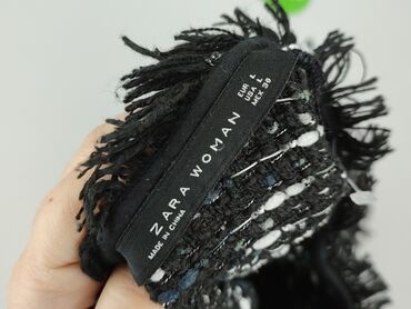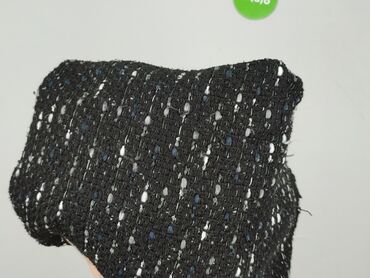 - Materiał: grubsza tkanina typu boucle/tweed z widocznym, wielobarwnym splotem (czarny z białymi i granatowymi akcentami)