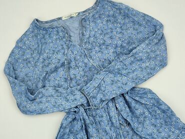 Sukienka damska „Made in Italy” z paskiem - Wzór: duże, malarskie kwiaty w odcieniach niebieskiego z żółtym środkiem na białym tle - Krój: luźna góra z krótkim rękawem, odcięcie i marszczenie w ta...